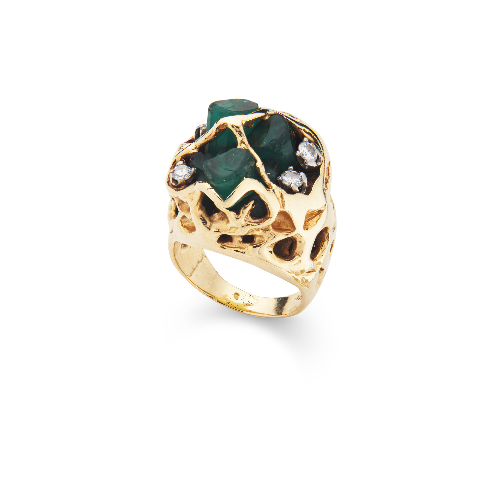 The stylised mount set with polished emerald crystals and four small round brilliant-cut diamonds, plain band, stamped 14k