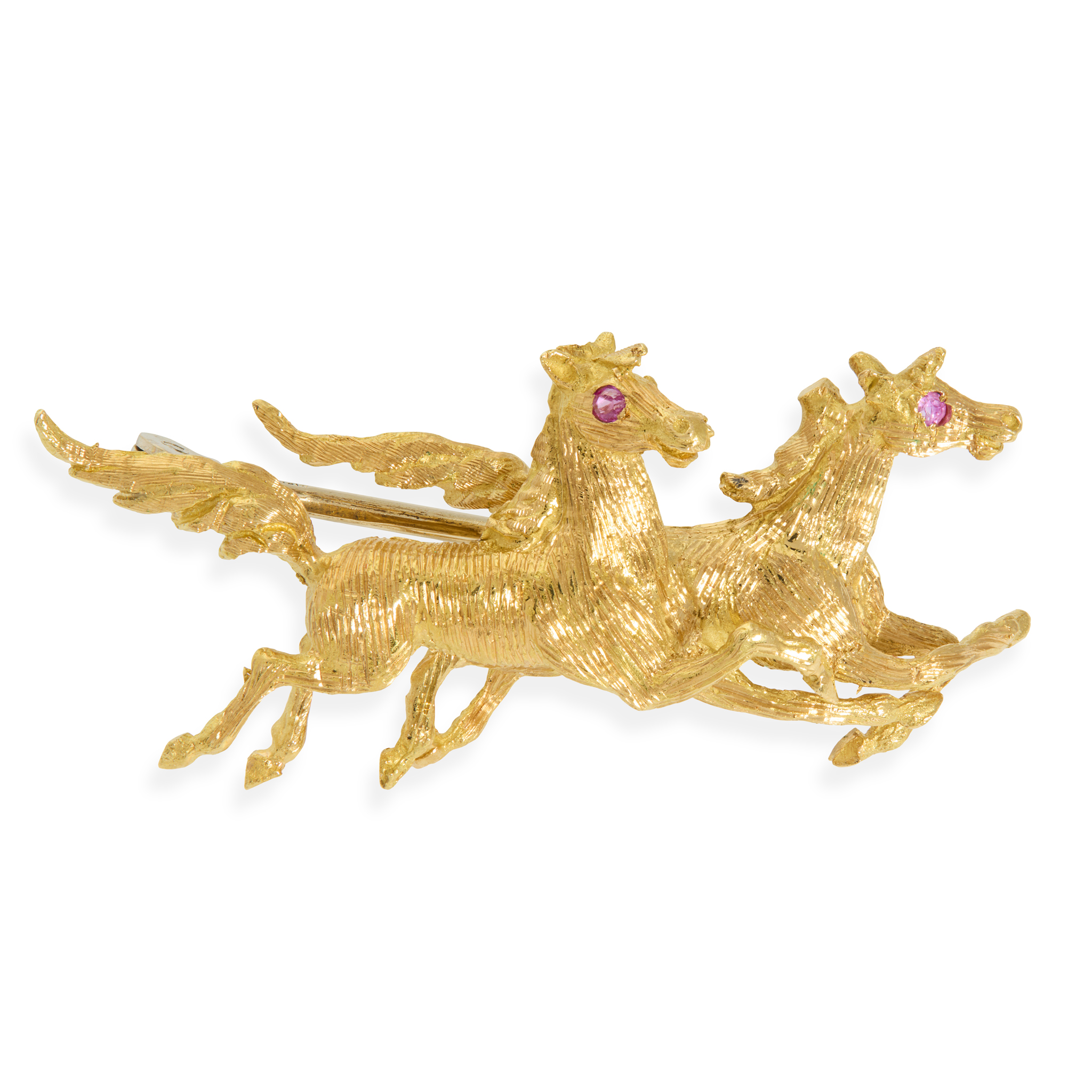 Modelled as two galloping horses, round-cut ruby eyes, stamped 750