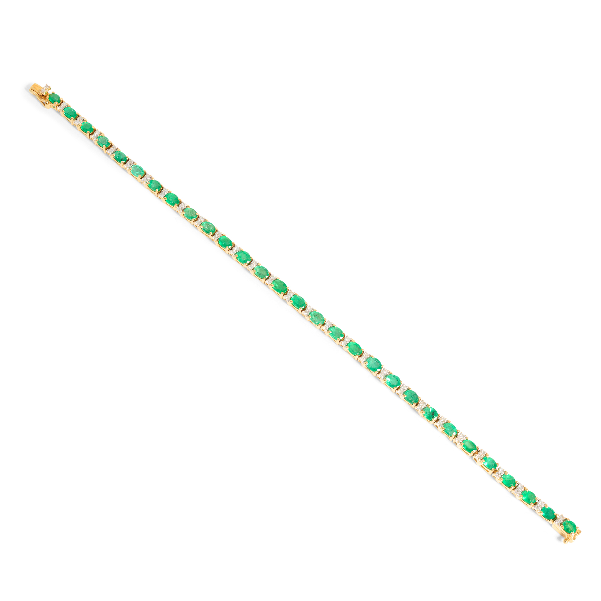 Claw-set with alternating oval-cut emeralds and pairs of small round brilliant-cut diamonds, concealed clasp, stamped K18 750