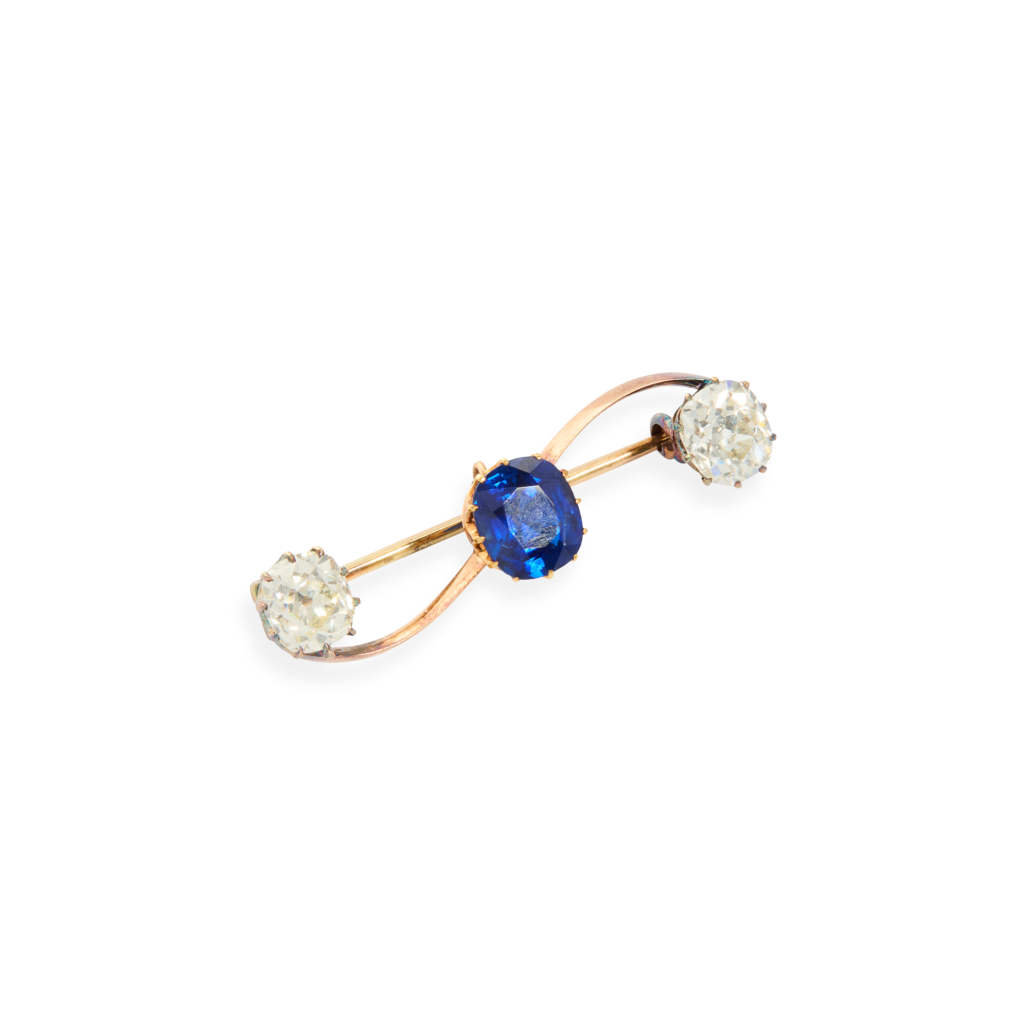 Claw-set with a cushion-cut sapphire, weighing approximately 3.00cts, the scrolling bar set at each terminal with an old cushion-cut diamond, weighing approximately 1.70cts each, unmarked
