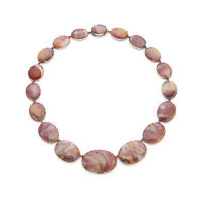 Composed of a single row of graduated oval polished agate links, unmarked; in a fitted box for Richard Ogden … Burlington Arcade