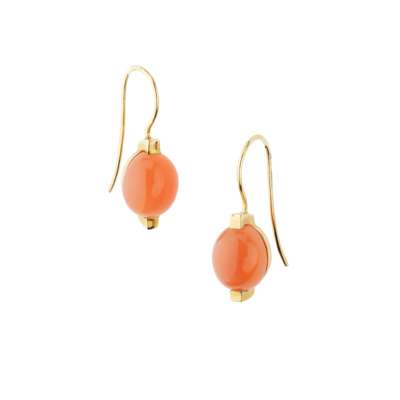 Each claw-set with a reddish orange moonstone, hook fittings, UK hallmark