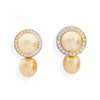 Each set with a golden South Sea pearl in a detachable bi-coloured halo of round brilliant-cut diamonds, with an optional ovoid South Sea pearl and marquise-cut brownish-orange diamond drop, post and butterfly fittings, stamped 750, with makers monogram