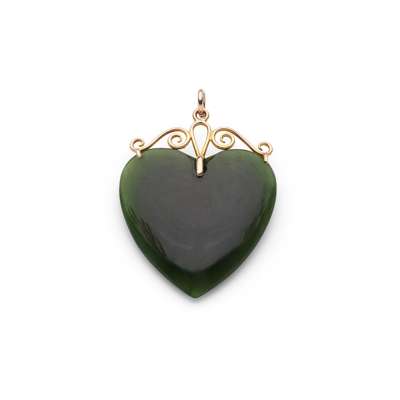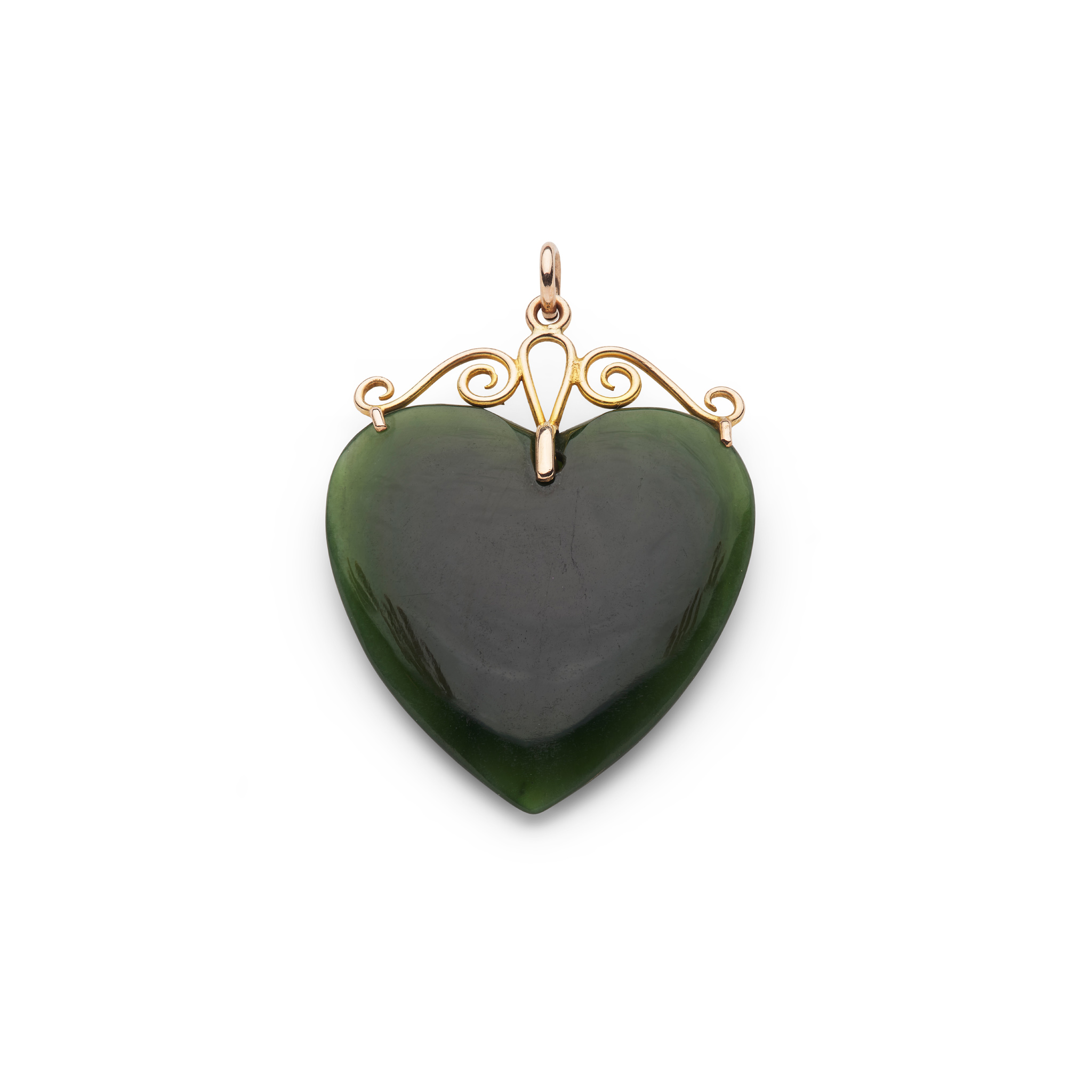 The polished heart-shaped nephrite jade pendant suspended from a belcher-link chain, stamped 9c