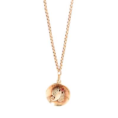 The circular pendant with applied scorpion detail, claw-set with a round-cut citrine, UK hallmarks; suspended from a belcher-link chain, stamped 9ct