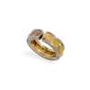 Gypsy-set with fifteen round brilliant-cut fancy coloured diamonds between pairs of small round brilliant-cut colourless diamonds, each side edge of the ring set with a row of round brilliant-cut colourless and fancy yellow diamonds, stamped 750, with makers monogram