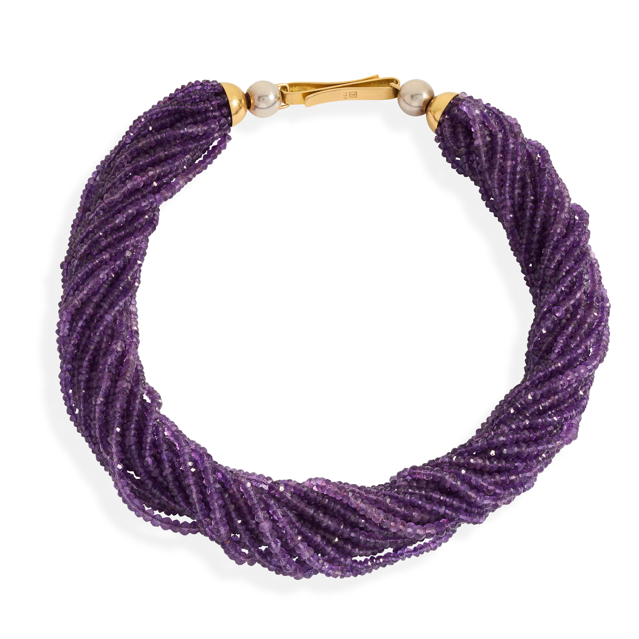 Composed of twenty strands of facetted-amethyst beads, hook clasp, stamped 750, with makers monogram