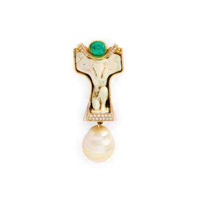 Set with an ancient Egyptian Late Period faience figure of the God Shu, below a diamond-set curve and a collet-set cabochon emerald, the lower mount pavé-set with round brilliant-cut diamonds, and suspending an ovoid South Sea pearl, stamped 750, with makers monogram