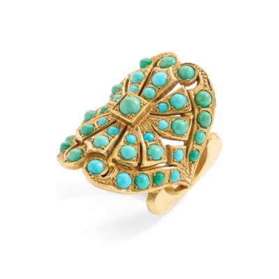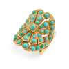 Of pierced, plaque design, pavé-set with graduated cabochon turquoises, on split shoulders with pierced detail, stamped 750