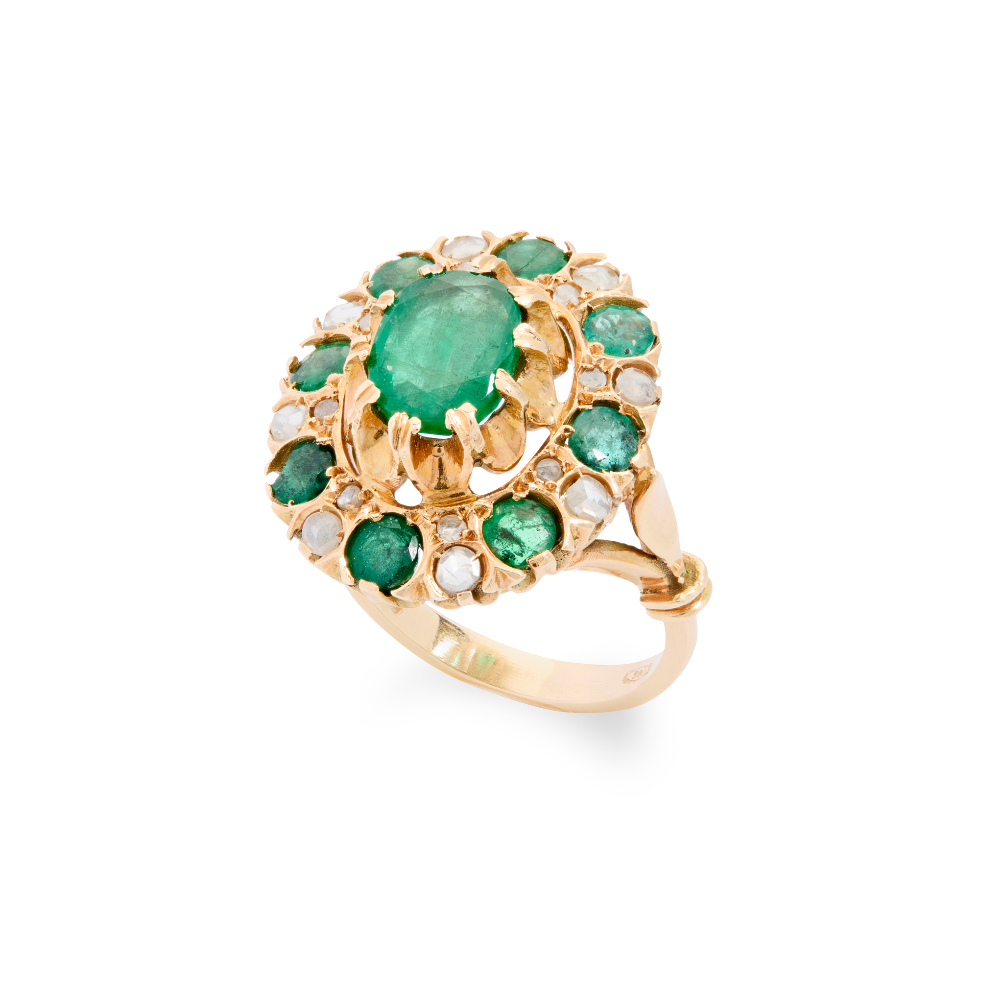 Claw-set with an oval-cut emerald, in a border of round-cut emeralds and pairs of rose-cut diamonds, plain band, stamped 500