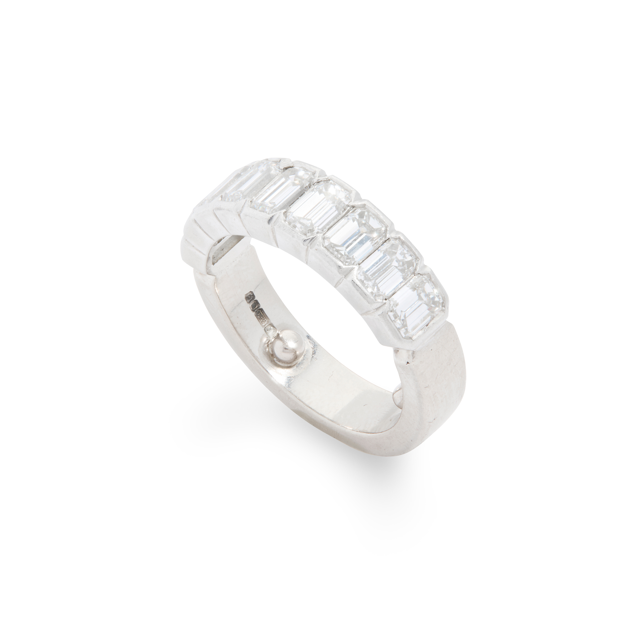 Part collet-set with nine slightly graduated emerald-cut diamonds, plain band, UK hallmark