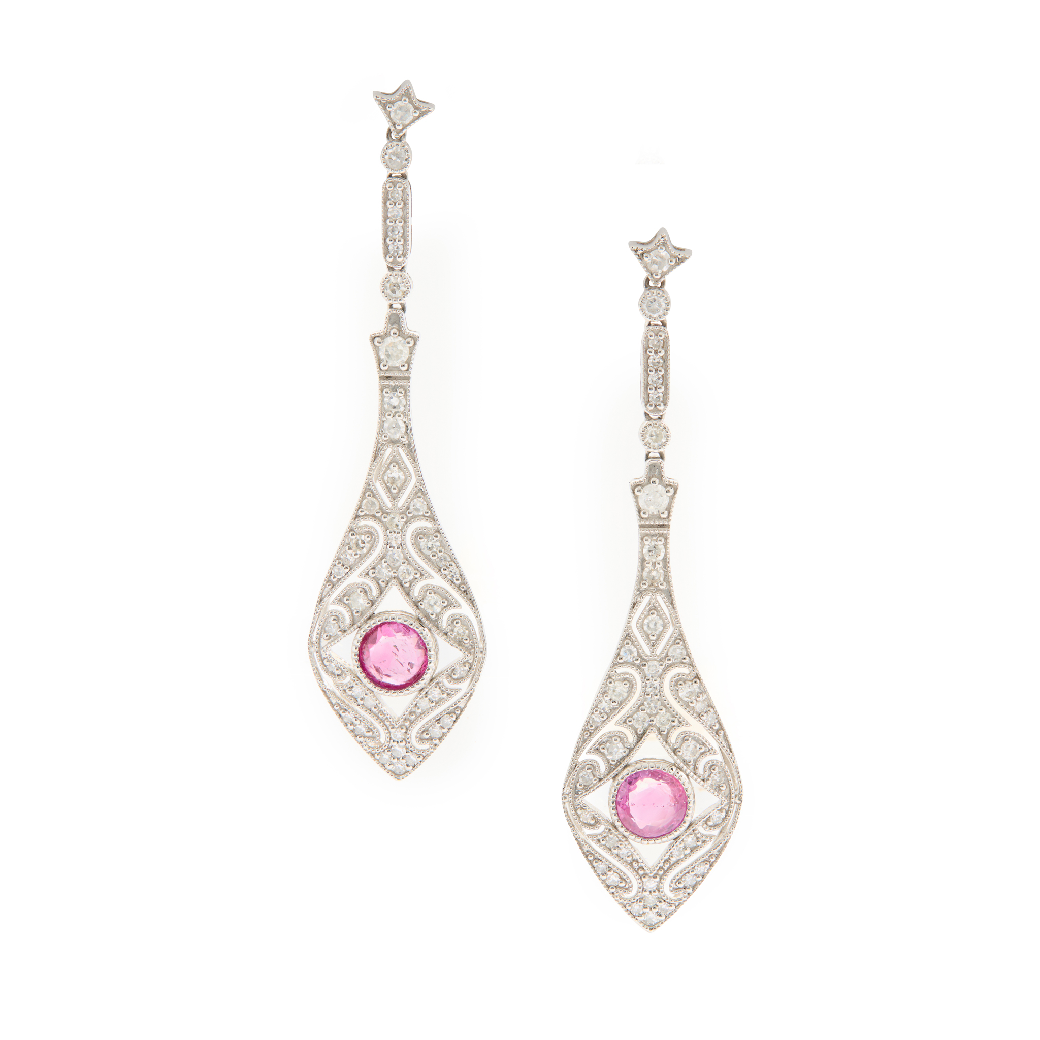 Each of pierced tapering design, set throughout with graduated eight-cut diamonds, millegrain-set with a round-cut ruby, post and butterfly fittings, unmarked