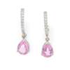 Each claw-set with a faceted pear-shaped pink sapphire, suspended from a hinged hoop, set to the front half with round-cut diamonds, with post fitting, stamped Pt950