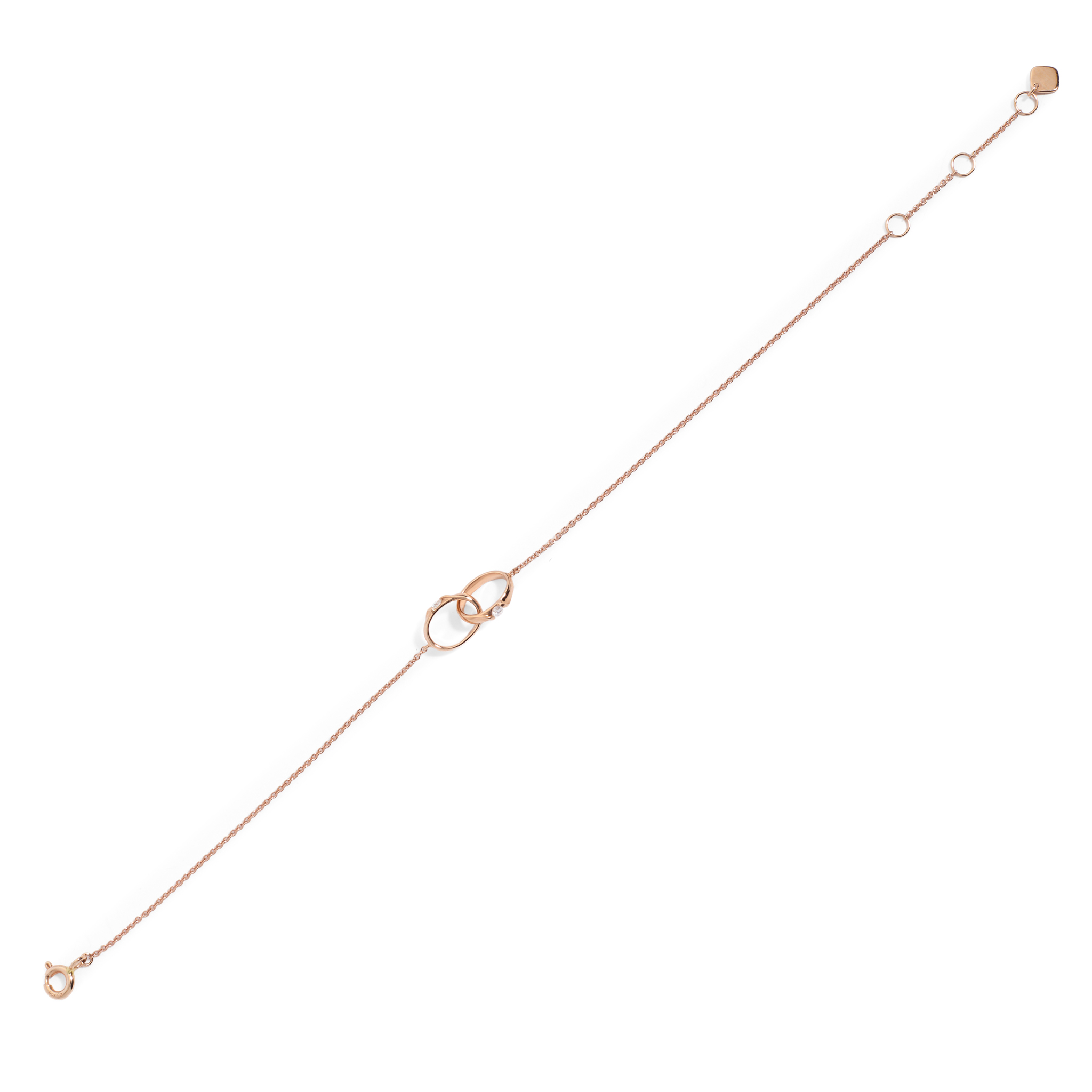Formed of two interlinked oval rings, each twist-set with a round-cut diamond, to a trace-link chain, stamped AU 750