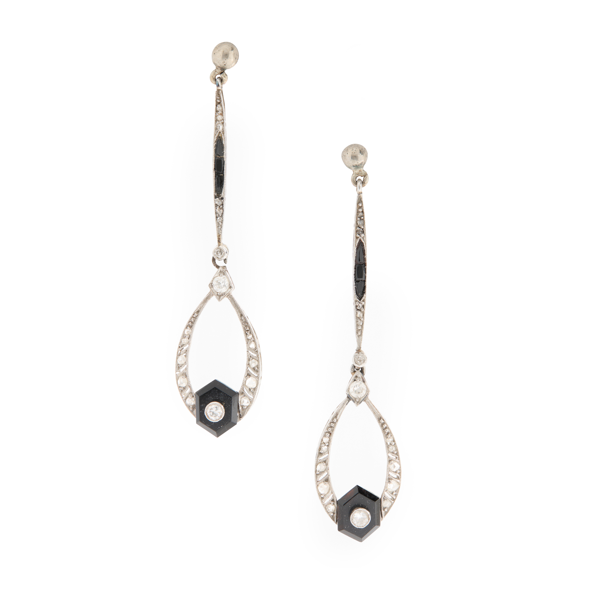 Each modelled as a tapering link suspending an open oval drop, set at intervals with calibré-cut onyx and rose-cut diamonds, millegrain-set with a central old round-cut diamond, post and butterfly fittings, unmarked