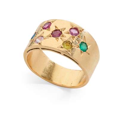 The band inset with a variety of star-set round-cut synthetic gemstones, plain band, unmarked