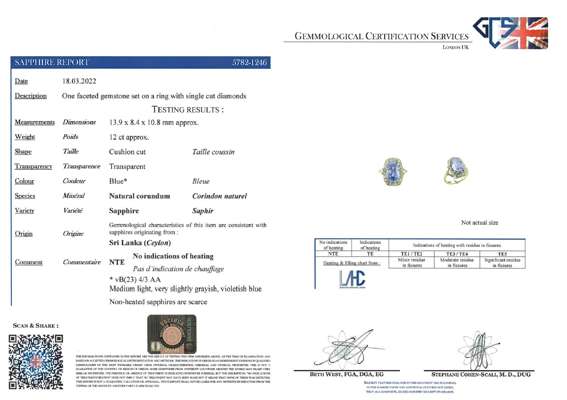 With accompanying report by Gemmological Certification Services, dated 18.03.2022, numbered 5782-1246, stating that the sapphire is approximately 12.00cts, of Sri Lankan origin, showing no evidence of heat treatment
