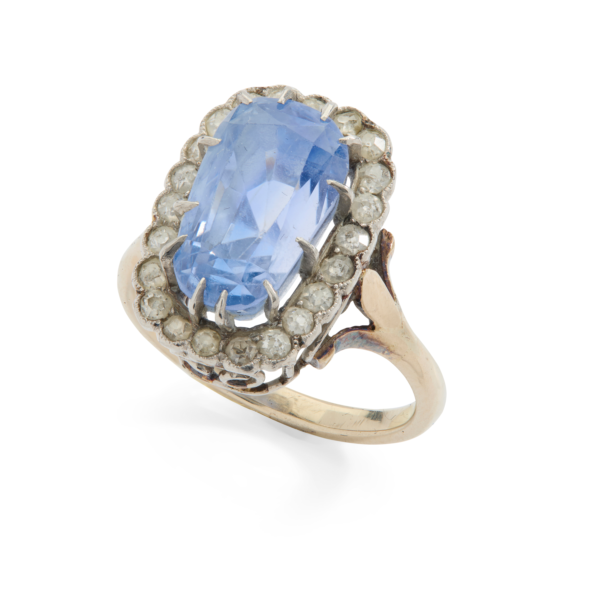 Claw-set with a slightly tapered cushion-cut Sri Lankan sapphire, in a border of eight-cut diamonds, plain band, unmarked