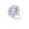 Claw-set with an oval cushion-cut sapphire, in a border of old round and cushion-cut diamonds, small eight-cut diamond detail, plain band, stamped PLAT