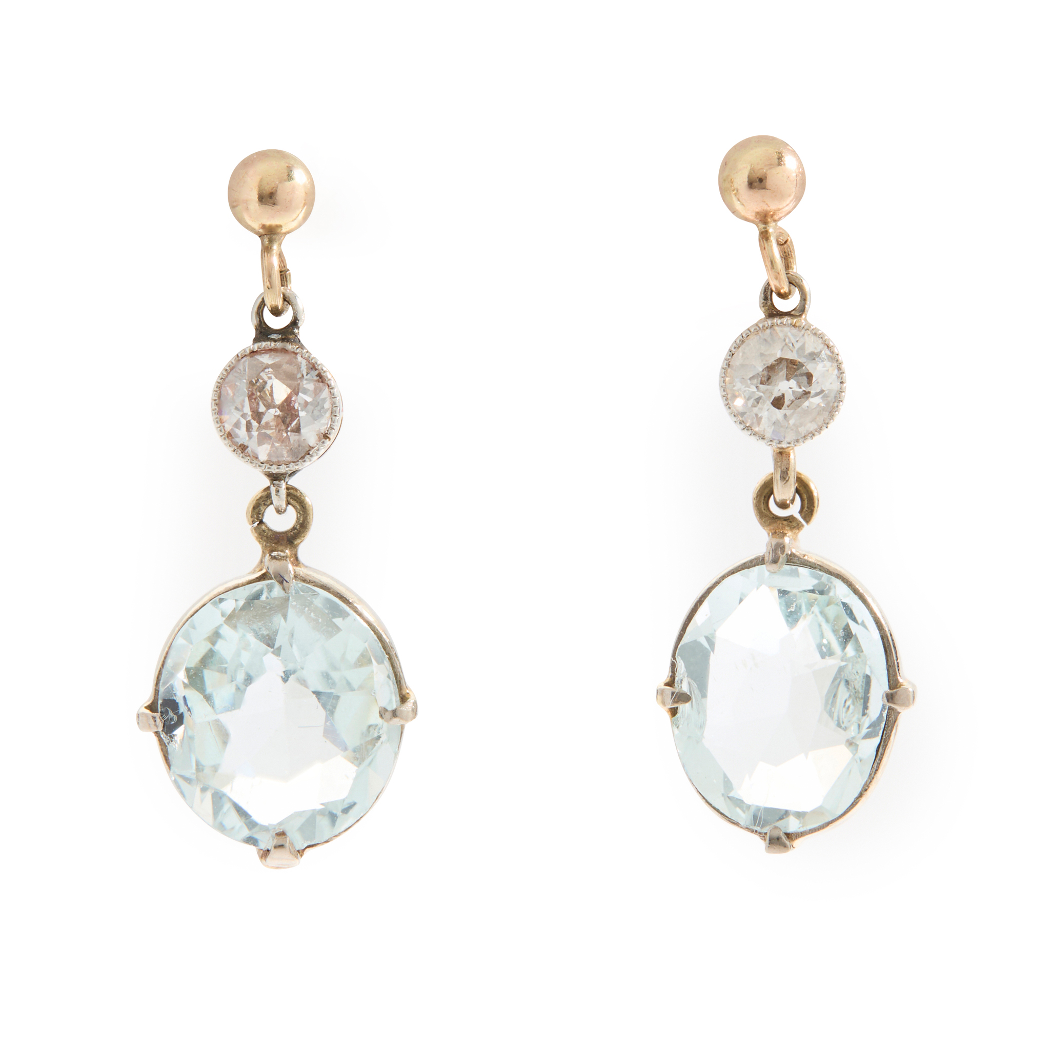 Each millegrain-set with an old round-cut diamond above an oval-cut aquamarine, post and butterfly fittings, UK hallmark