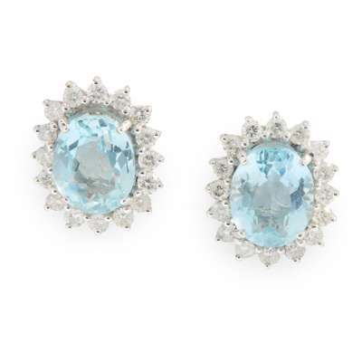 Each claw-set with an oval-cut aquamarine, in a border of round brilliant-cut diamonds, post and butterfly fittings, UK hallmark