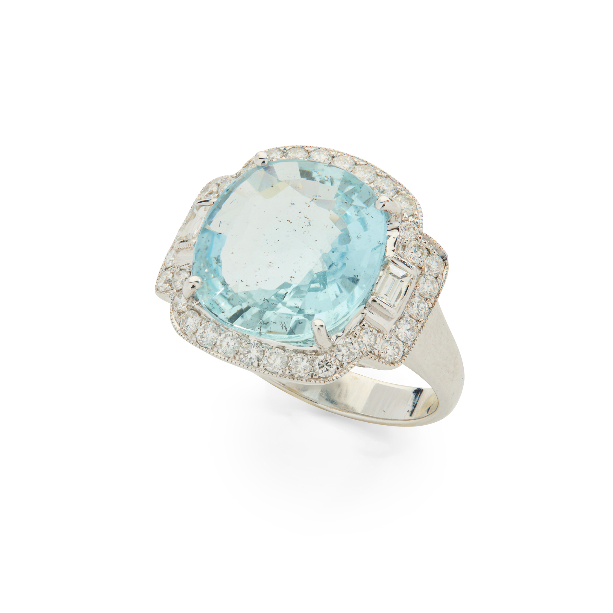 Claw-set with a large cushion-cut aquamarine, set to either side with a baguette-cut diamond, within a border of round brilliant-cut diamonds, stamped 750