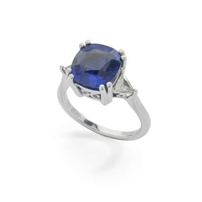 Claw-set with a cushion-cut sapphire, and two trilliant-cut diamonds, plain band, UK hallmark