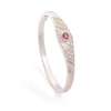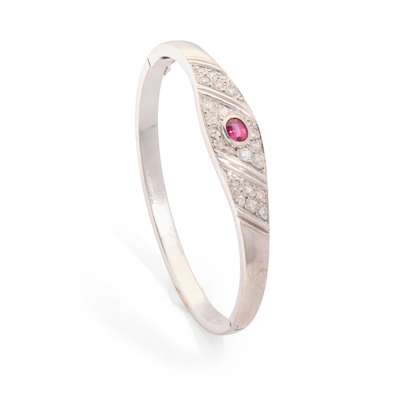 Of hinged design, the front collet-set with an oval-cut ruby, in a border of graduated round brilliant-cut diamonds, stamped 750