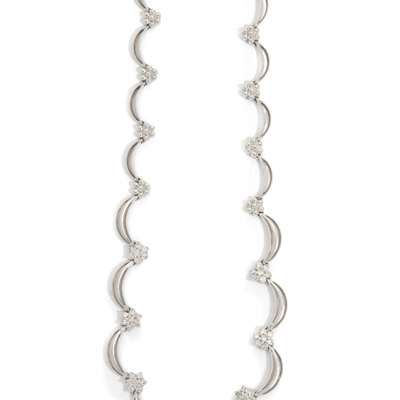 Claw-set with seven round brilliant-cut diamond clusters, swag-style joining links and smaller beaded clusters, stamped 750