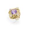 Collet-set with a cushion-cut amethyst, within a pierced, scrolling bezel of plaque design, set with four old-cut diamonds, bifurcated shoulders, plain band, unmarked