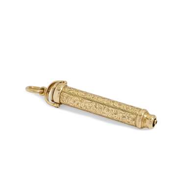 Of cylindrical design, with engraved scrolling foliate detail, extending to reveal blank panels with engraved presentation inscription and makers mark, carnelian set terminal, signed, unmarked