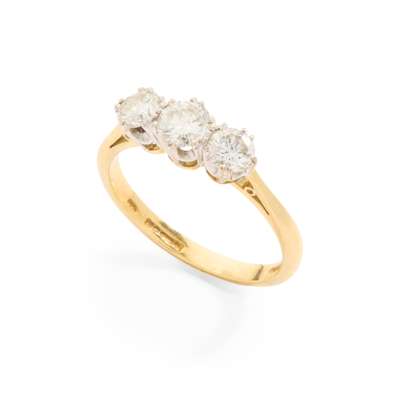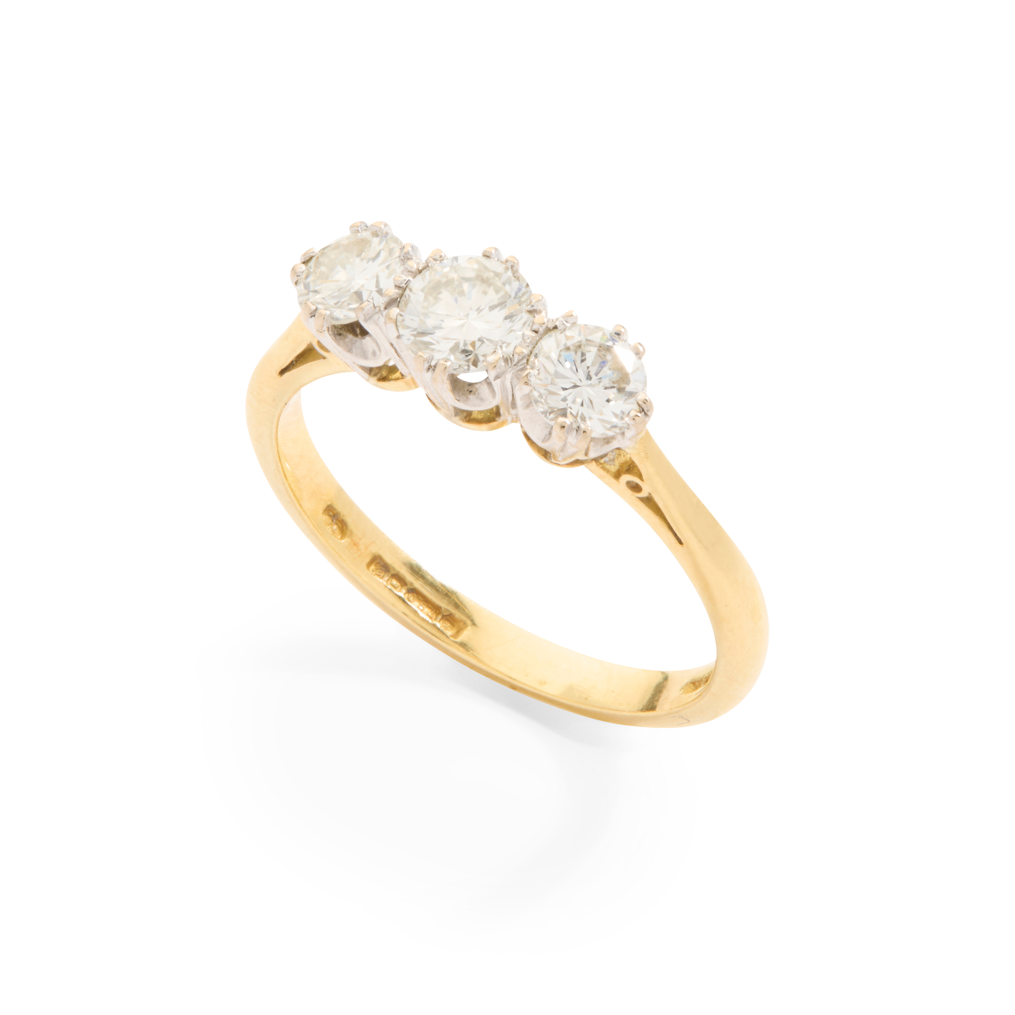 Claw-set with three graduated round brilliant-cut diamonds, plain band, UK hallmark