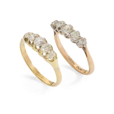 Including a late 19th century diamond five-stone ring, set with graduated old cushion-cut diamonds, plain band, stamped 18CT; and an early 20th century old-cut diamond five-stone ring, plain band, stamped 18CT and PLAT (2)