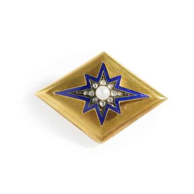 Of navette form, the central star motif set with a split pearl surrounded by rose-cut diamonds, within a blue enamel border, glazed hair panel to reverse, maker's mark, stamped 18