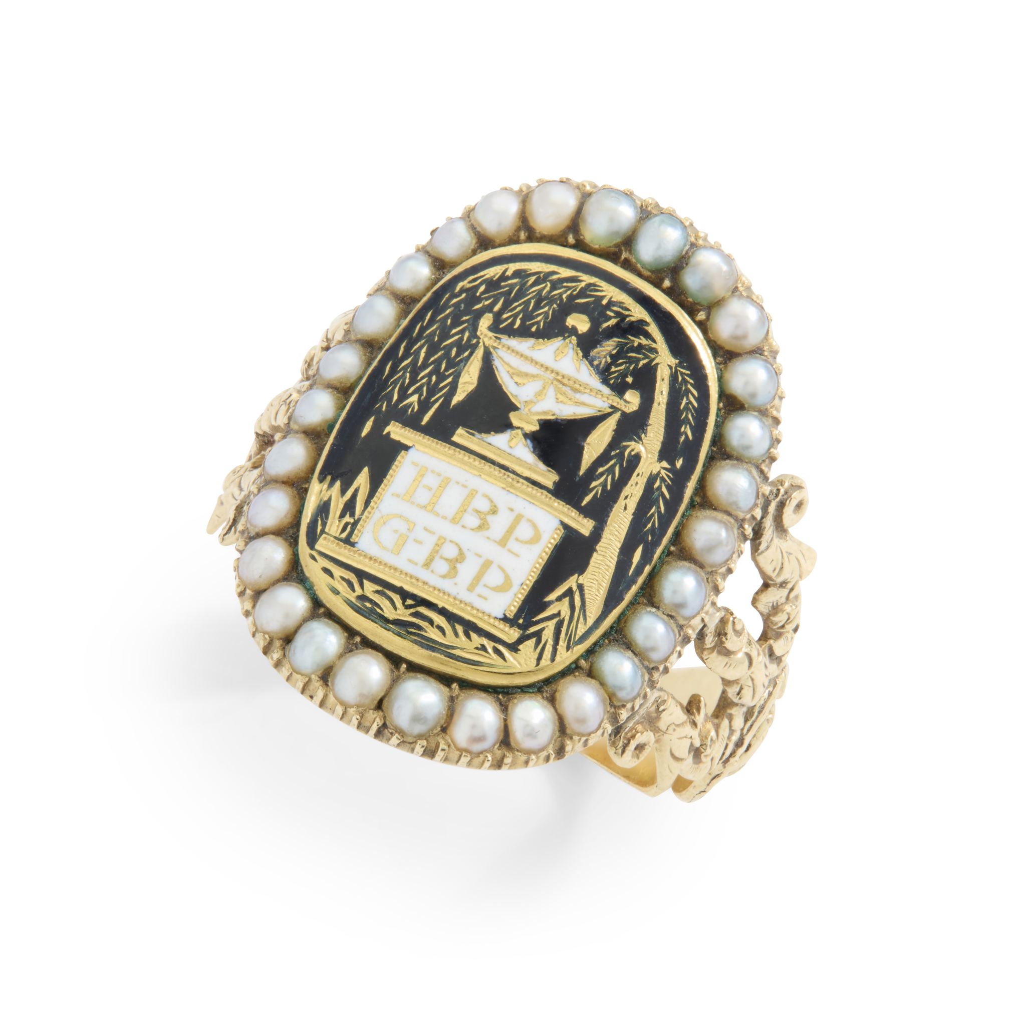 The central rounded rectangular panel with urn motif, over a pedestal base reading HBP GBP, with black and white enamel detail, within a border of split pearls, the reverse engraved George Battershell Parker OB. 7 Oct. 1820 AE: 8 Months, on trifurcated scrolling foliate shoulders with rose motif detail, unmarked