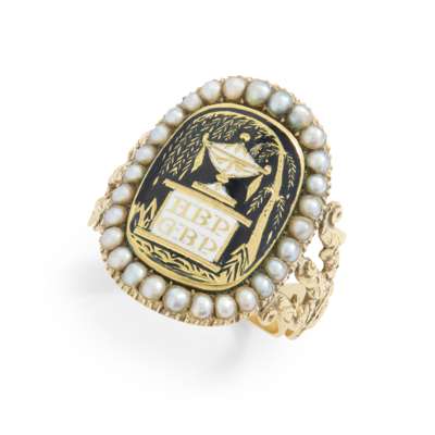 An early 19th century enamel and pearl mourning ring
