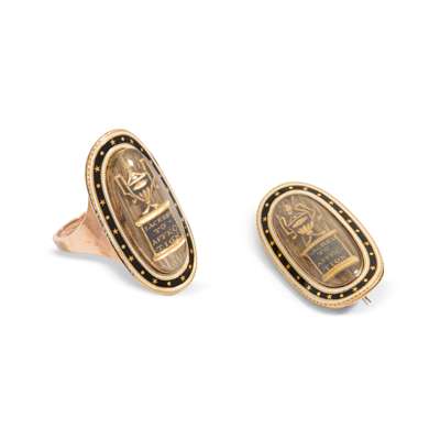 Each formed of an oval glazed panel encasing a twin handled urn with pedestal base reading ‘SACRED TO AFFECTION’, over hair detail, within white and black enamel borders, each with reverse engraved ‘D. Scotland died 17 March 1791 Ag.d 62 Years 5 Months’, unmarked