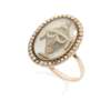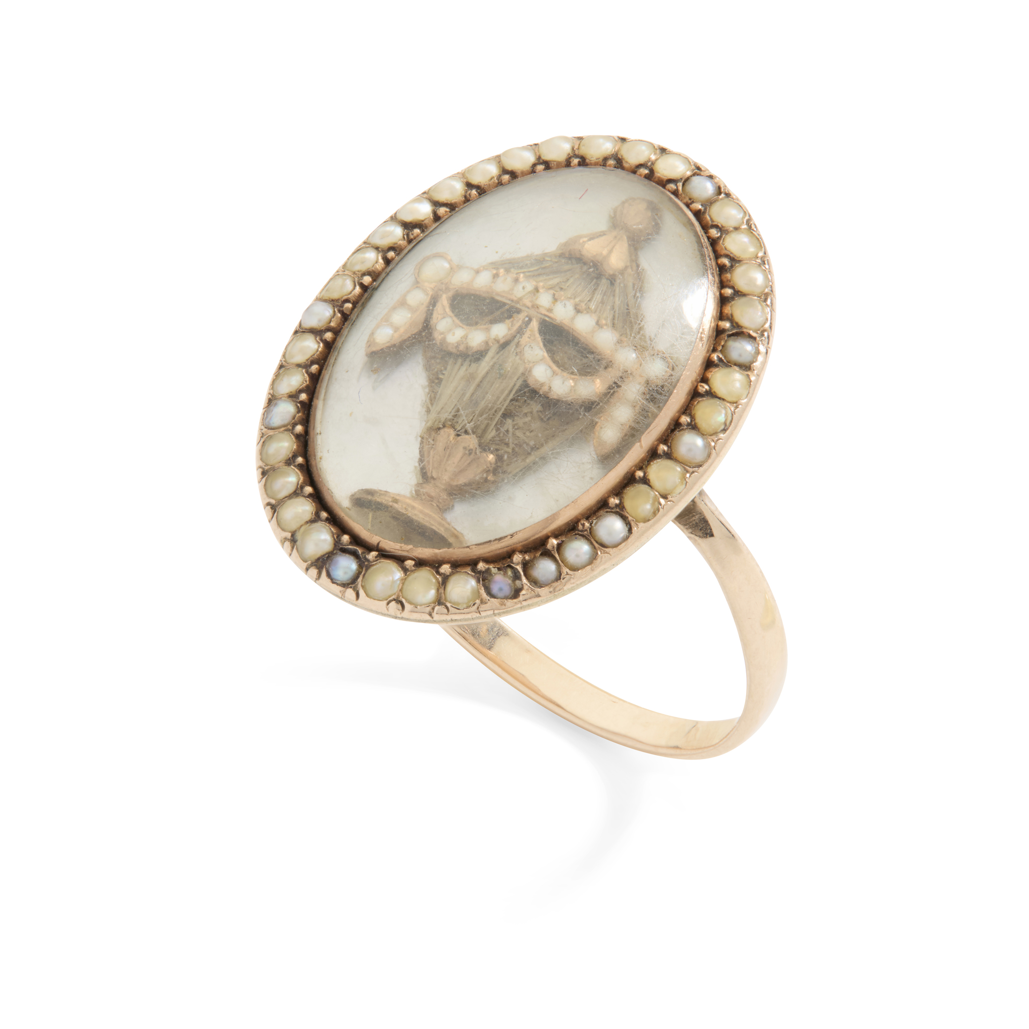 The central oval glazed panel encompassing an urn motif, with hair and pearl detailing, over a mother-of-pearl ground, in a border of seed pearls, plain band, unmarked