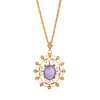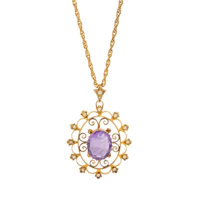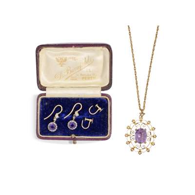 Each set with a round-cut amethyst in a border of rose-cut diamonds, suspended from a rose-cut diamond drop, hook fittings, unmarked; together with an amethyst and seed pearl pendant, of oval pierced design, unmarked; to a trace-link chain (2)