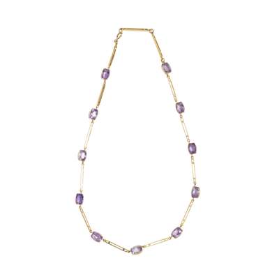 Collet-set with eleven faceted amethysts, interspaced by elongated oval fancy links, stamped 9K and 9ct