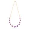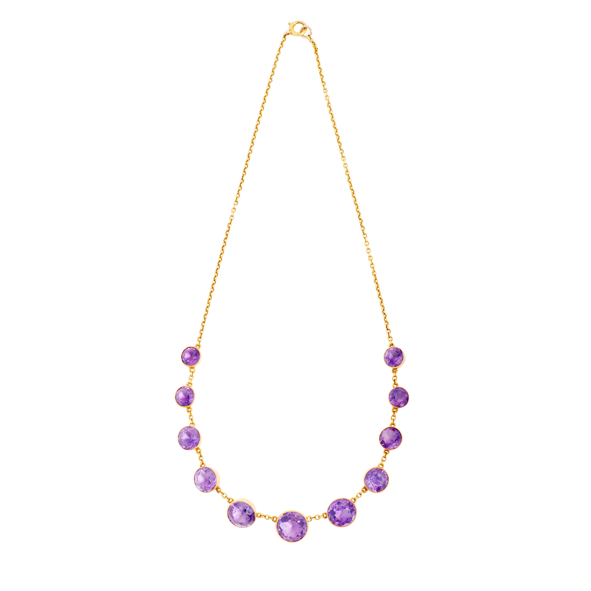 Composed of a single row of eleven collet-set graduated round-cut amethysts, to a trace-link chain, stamped 15