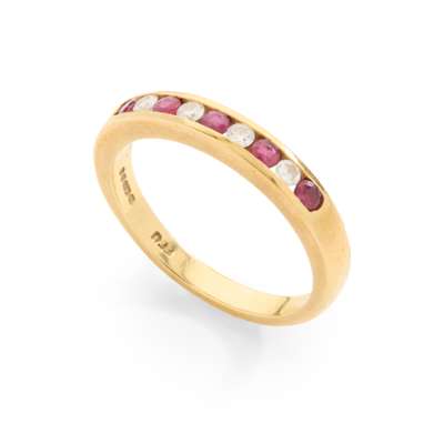 Channel-set with round-cut rubies, interspaced by round-cut diamonds, UK hallmark