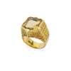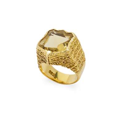 Collet-set with a shield-shaped citrine, within a bezel inscribed with rows of symbols, plain band, stamped 750