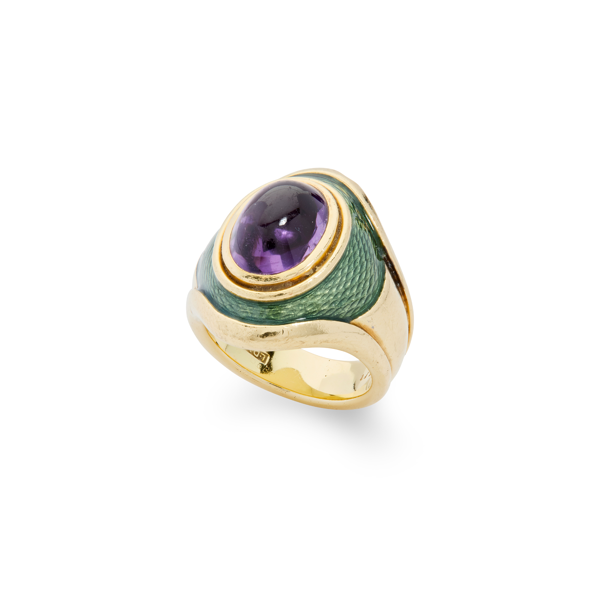 Leo de Vroomen: An 18ct gold amethyst and green enamel ring