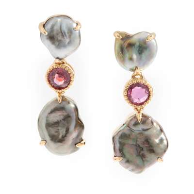 Each claw-set with two Tahitian pearls, interspaced by a collet-set round-cut ruby, to post fittings, stamped 14K