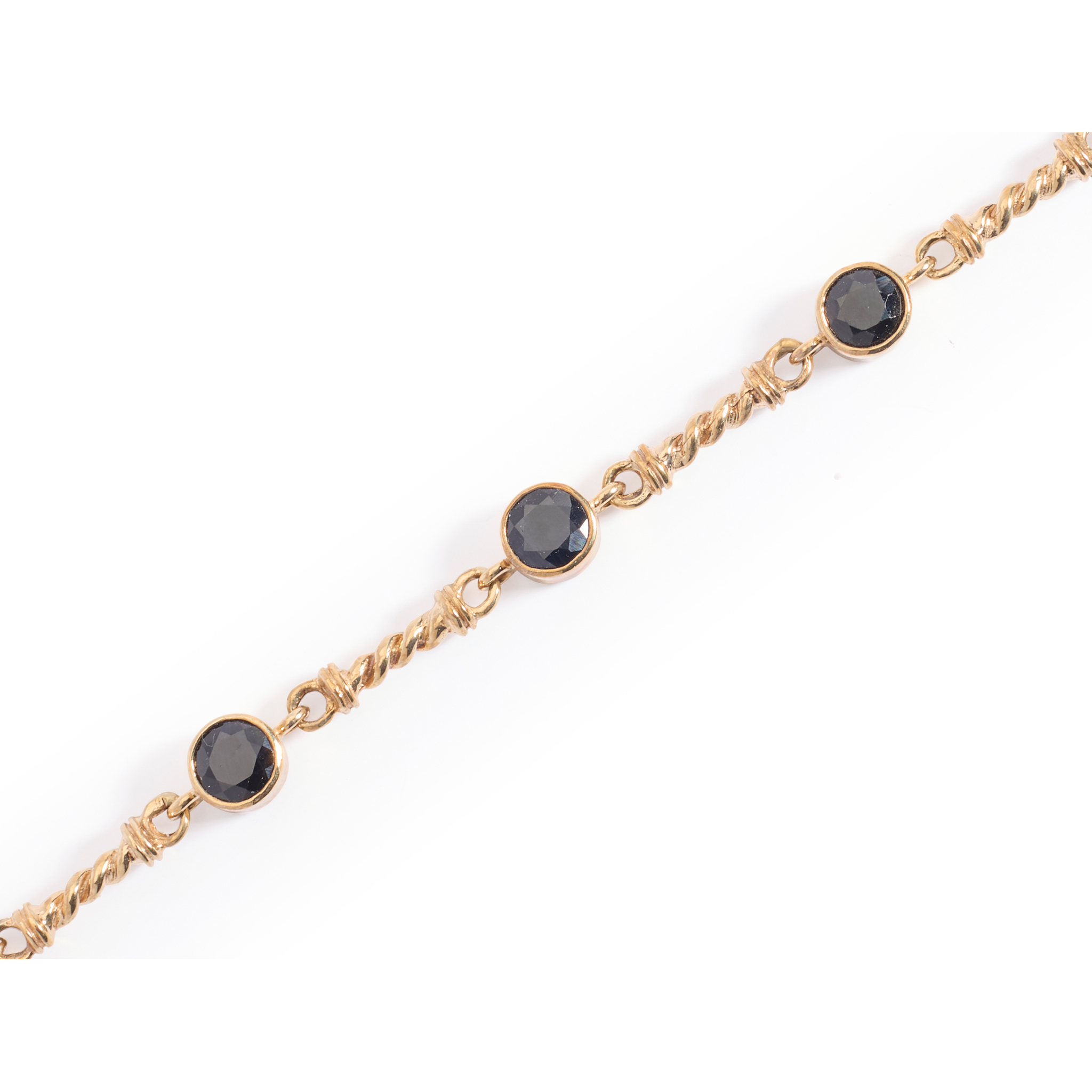 Collet-set with seven round-cut sapphires, between twisted bar links, stamped 375