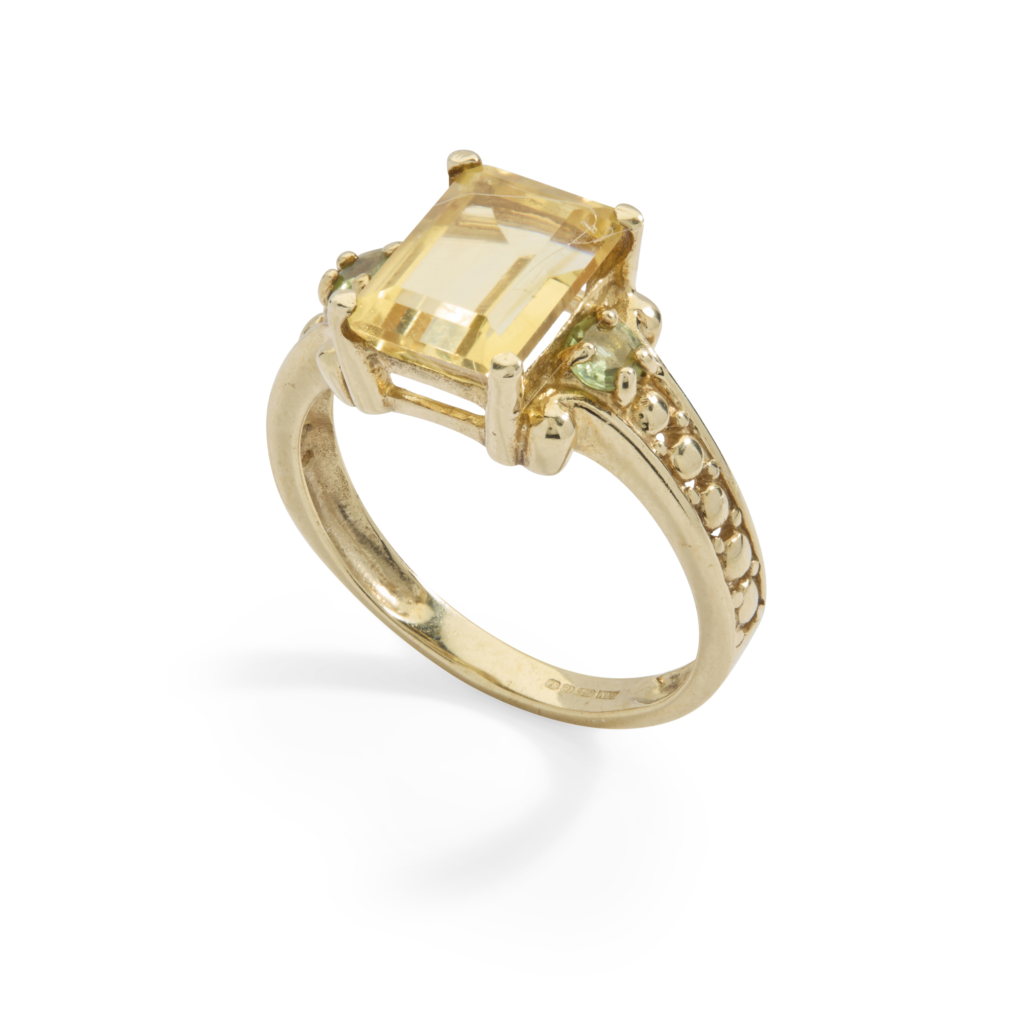 Claw-set with a step-cut citrine, set to either side with a round-cut peridot, on scrolling openwork shoulders, plain band, UK hallmark