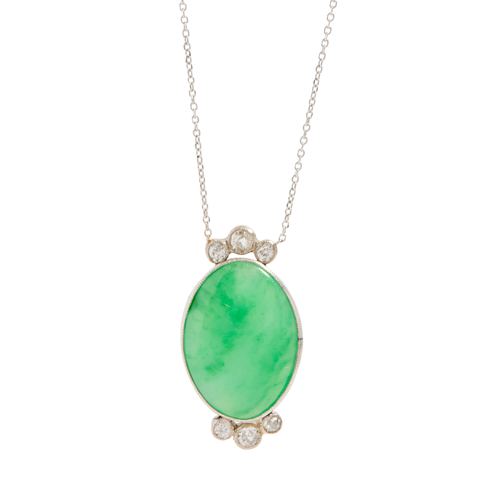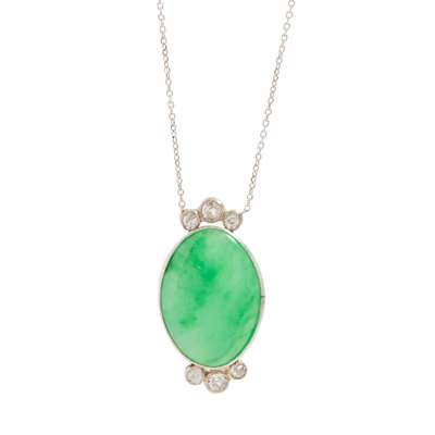 Collet-set with an oval cabochon jadeite jade panel, and six graduated old round-cut diamonds, integral trace-link chain, unmarked