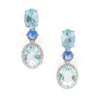 Claw-set with an oval-cut aquamarine within a border of round-cut diamonds, suspended from a claw-set round-cut sapphire, below a claw-set oval-cut aquamarine, post and butterfly fittings, stamped Pt950