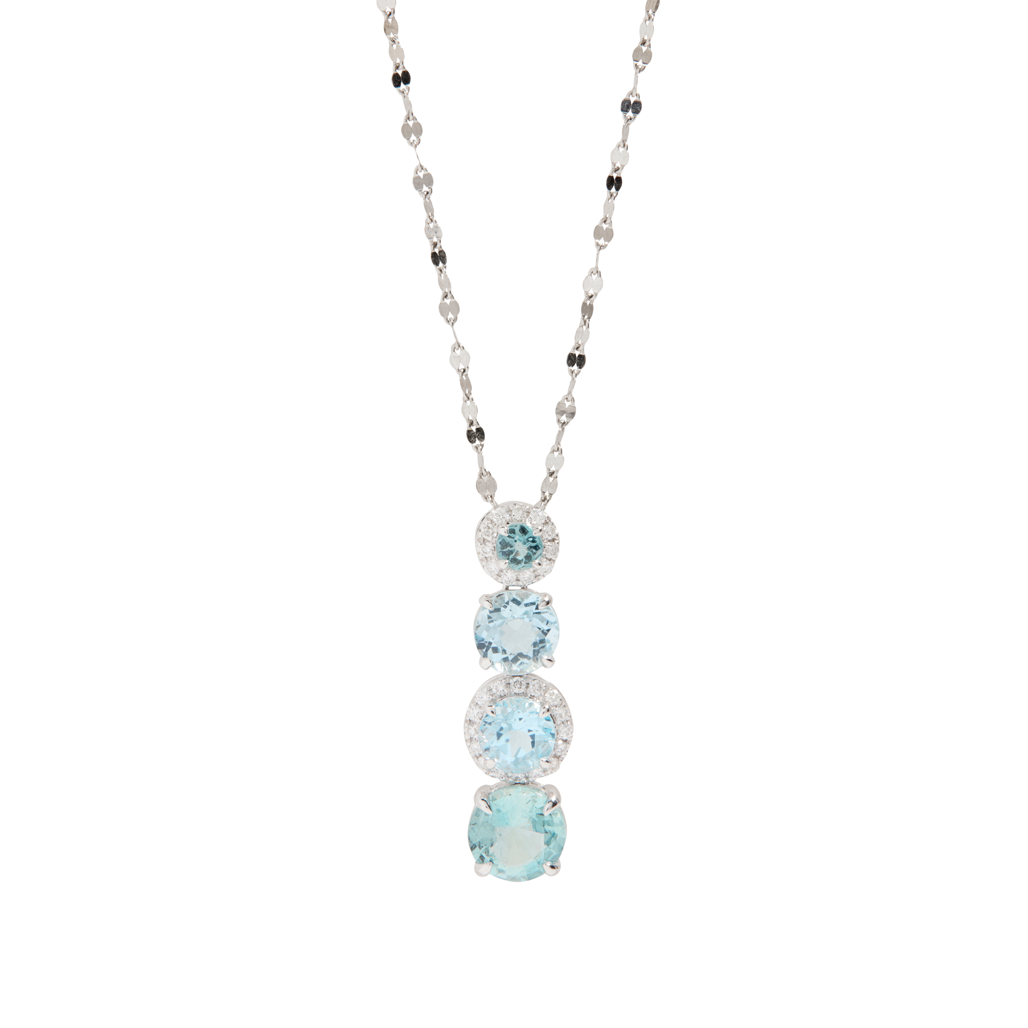 Formed as a row of four graduated claw-set aquamarines, alternately bordered with round-cut diamonds, stamped Pt950; to a fancy link chain, UK hallmarks